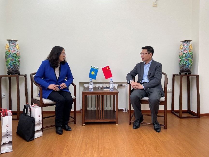 代表团还专程走访了中华人民共和国驻哈萨克斯坦阿克托别领事馆,总领事郭宇先生亲切接见代表团一行。代表团向郭宇总领事详细汇报了我校在推进郑和学院建设、开展国际中文教育、深化新能源产业合作等方面的进展情况及未来规划。郭宇对我校在中哈教育合作中发挥的积极作用给予高度肯定,并表示领事馆将持续为我校在哈开展各类教育交流项目提供支持,尤其在文化交流、中文推广、旅游合作、产教融合、青年交流等领域给予重点协助,助力中哈教育合作走深走实。